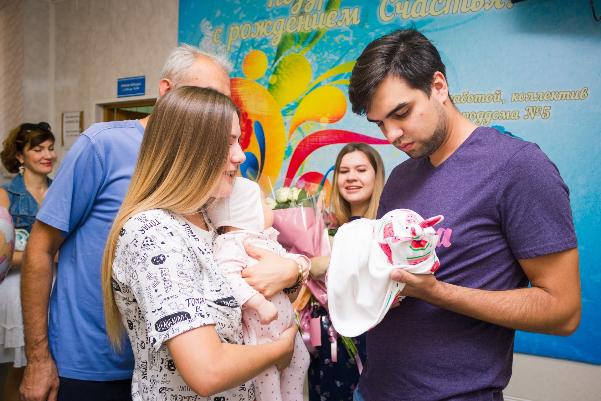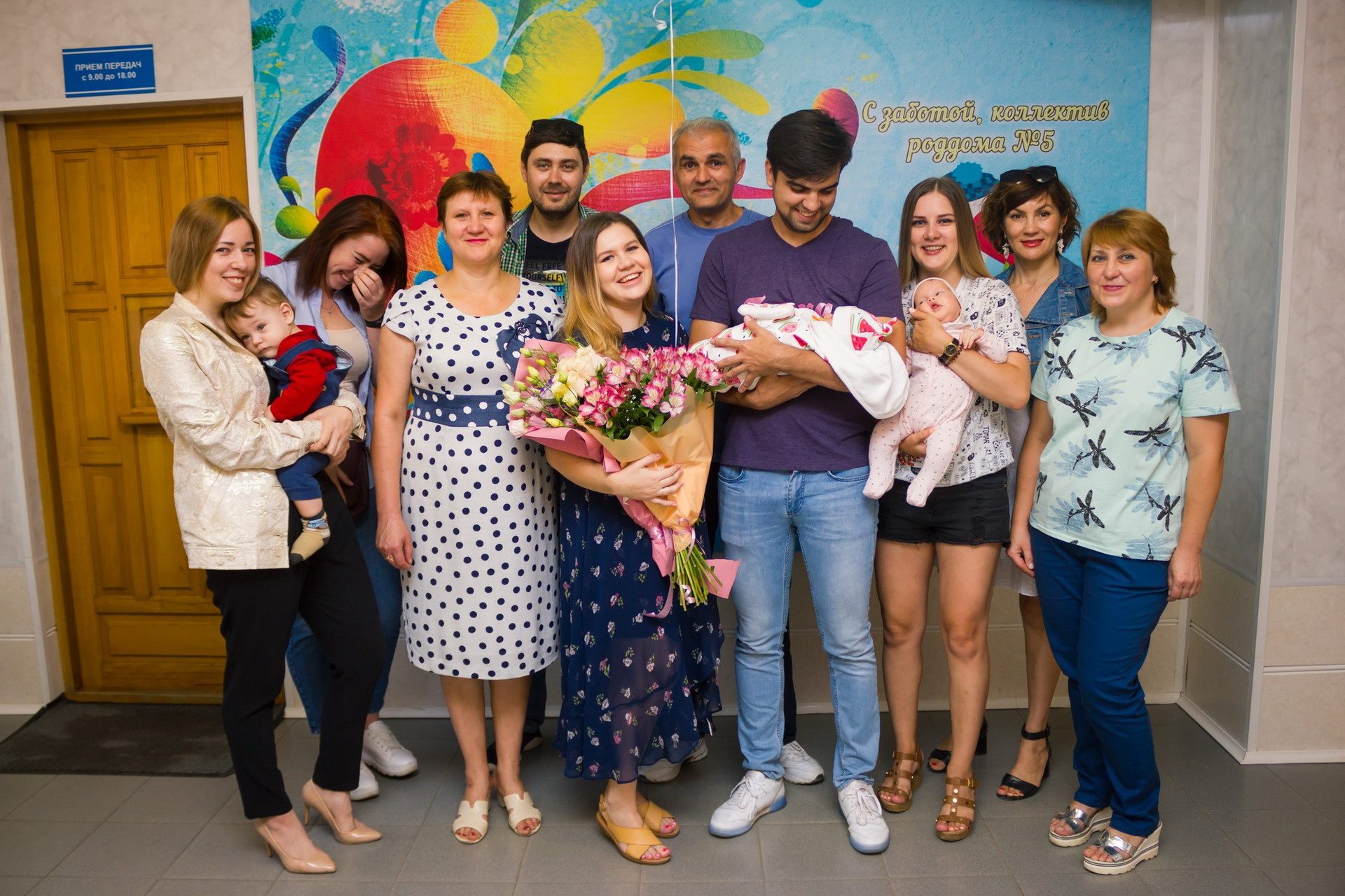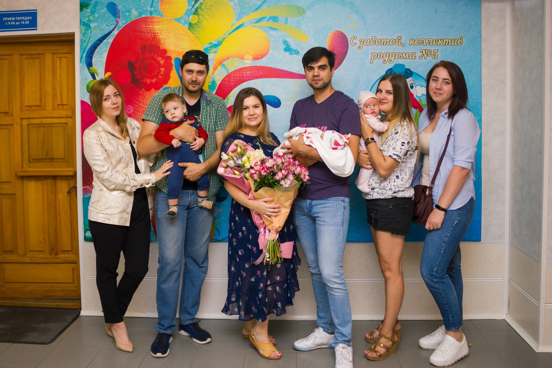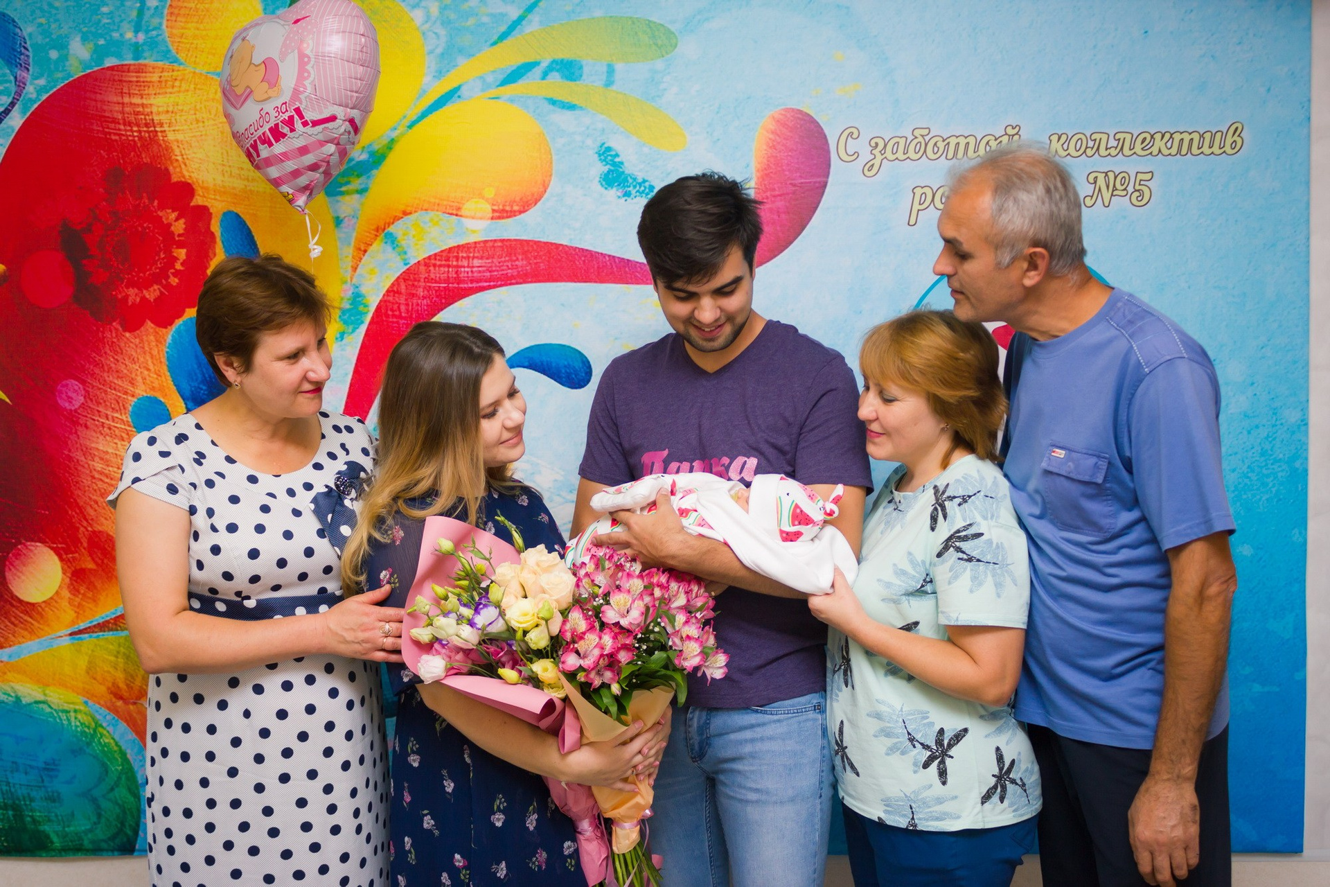 - съёмка родственников, которые с букетами и шариками приехали познакомиться с новорождённым;
