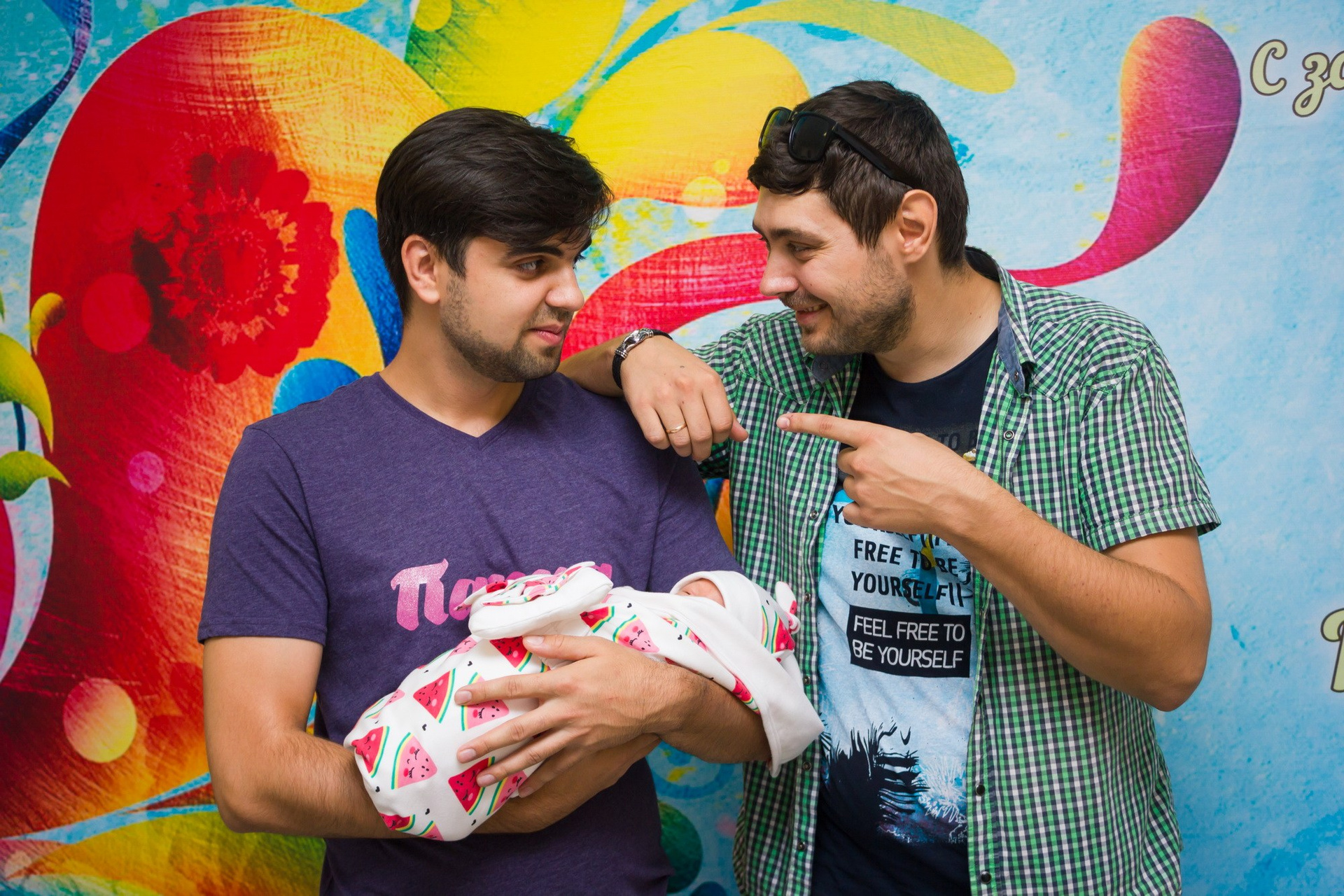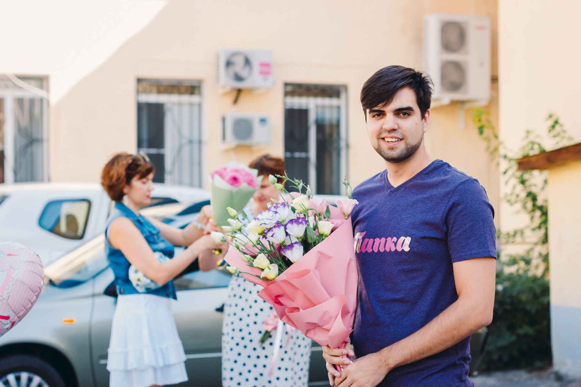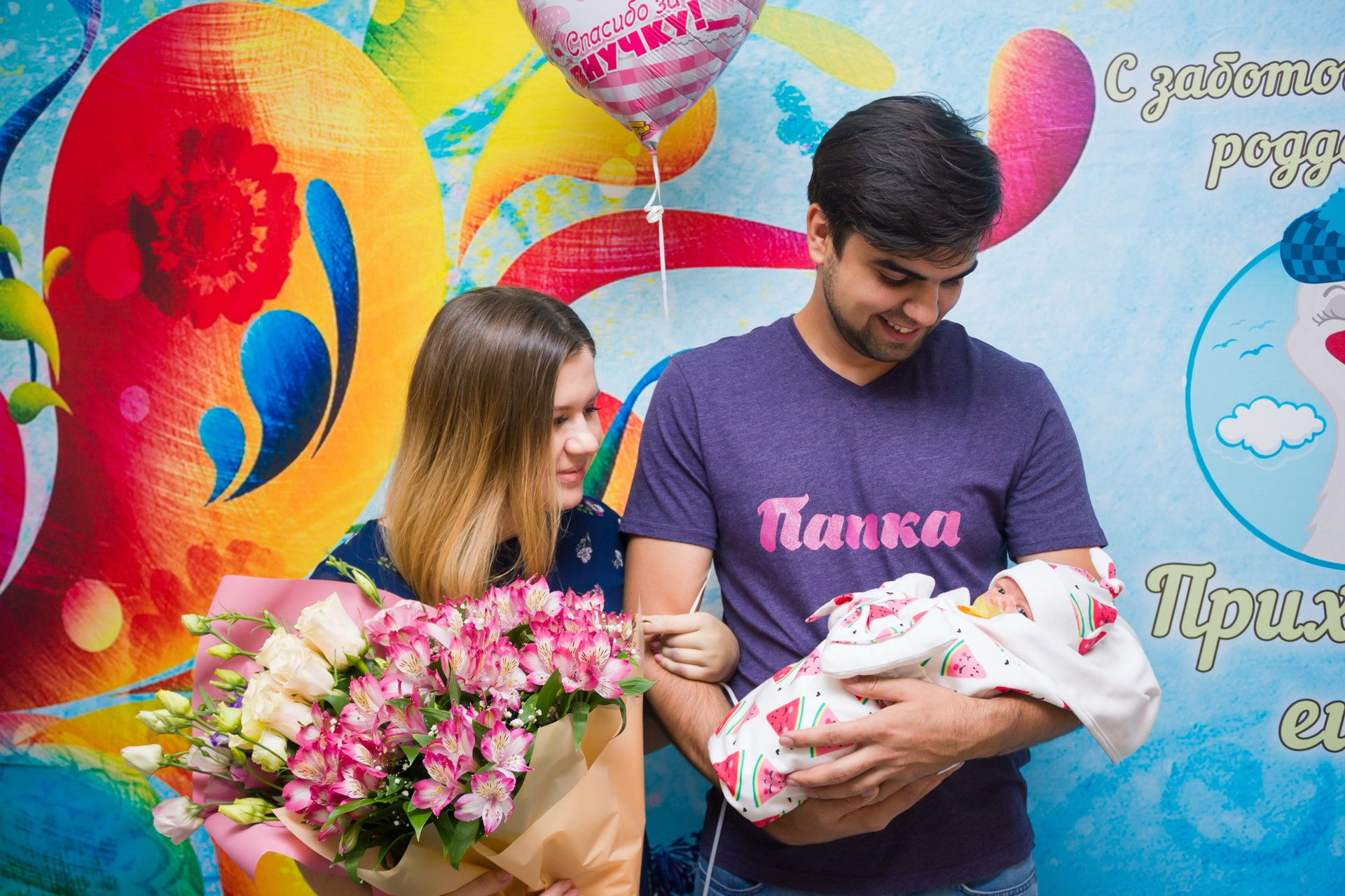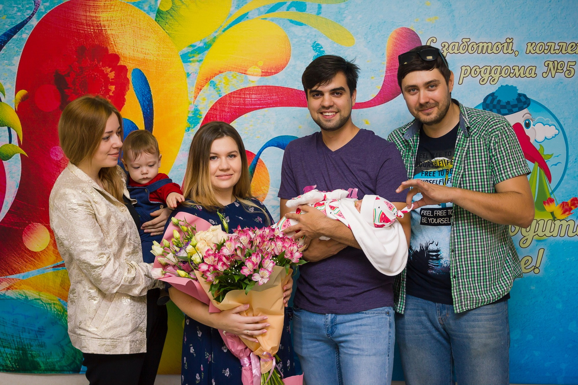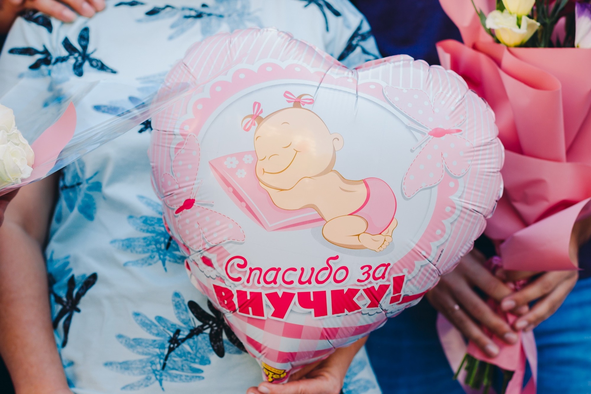 - съёмка родственников, которые с букетами и шариками приехали познакомиться с новорождённым;